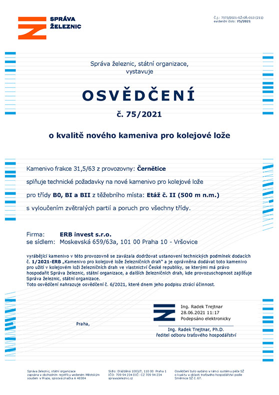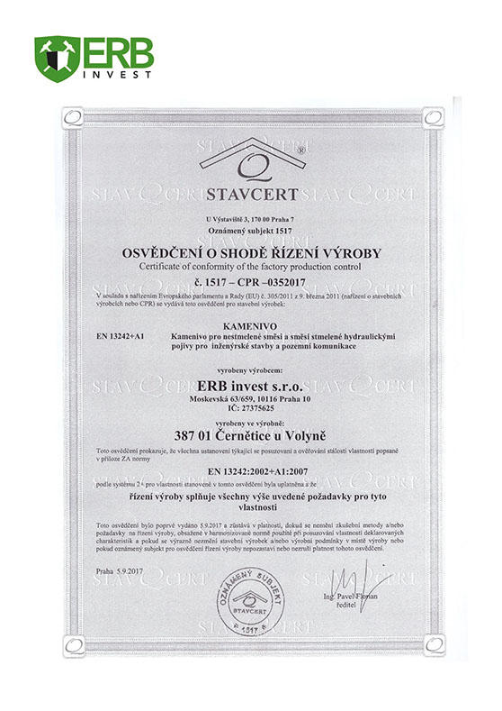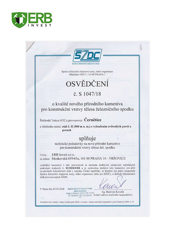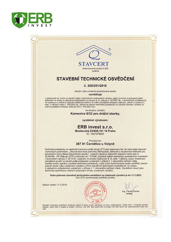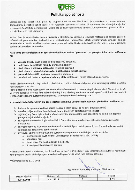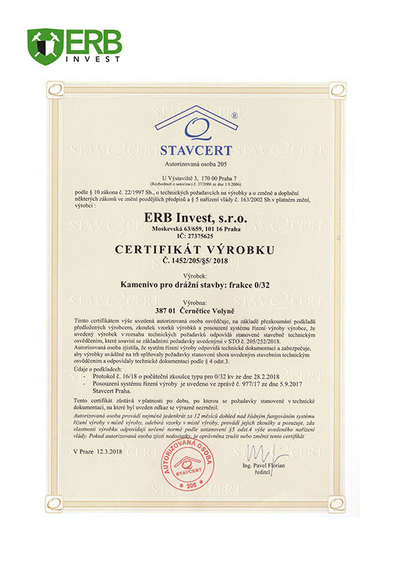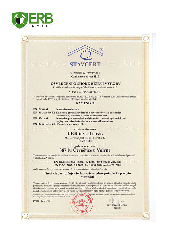 Společnost ERB invest s.r.o. patří do skupiny RPM service. ERB invest je vlastníkem a provozovatelem Kamenolomu Černětice, jehož součástí je i recyklační centrum a skládka. Disponujeme vlastní strojní a výrobní technologií. Součástí kamenolomu je i vlečka pro dodávky kameniva po železnici. Kamenolom má plnou certifikaci pro výrobu všech typů kameniva.